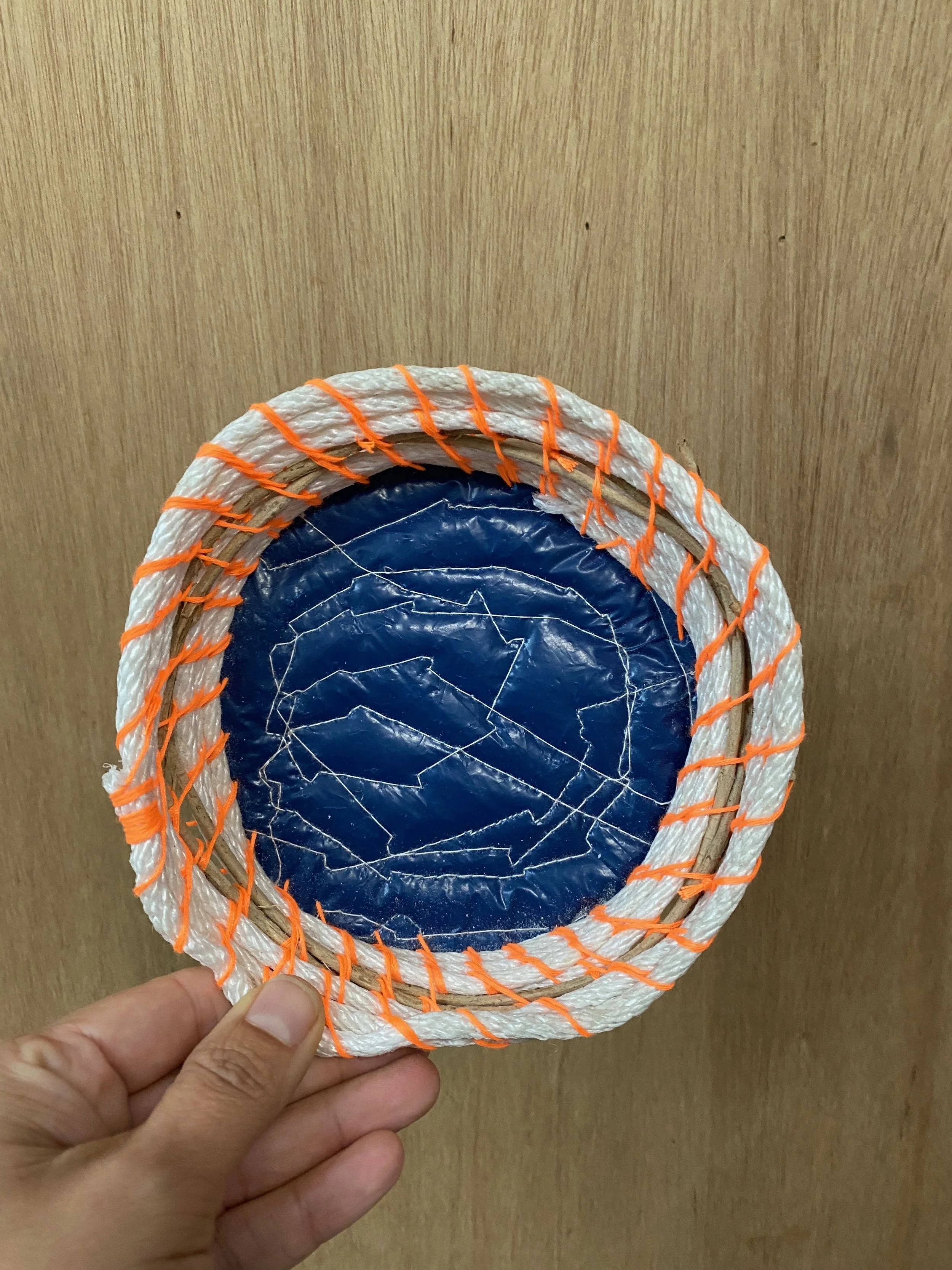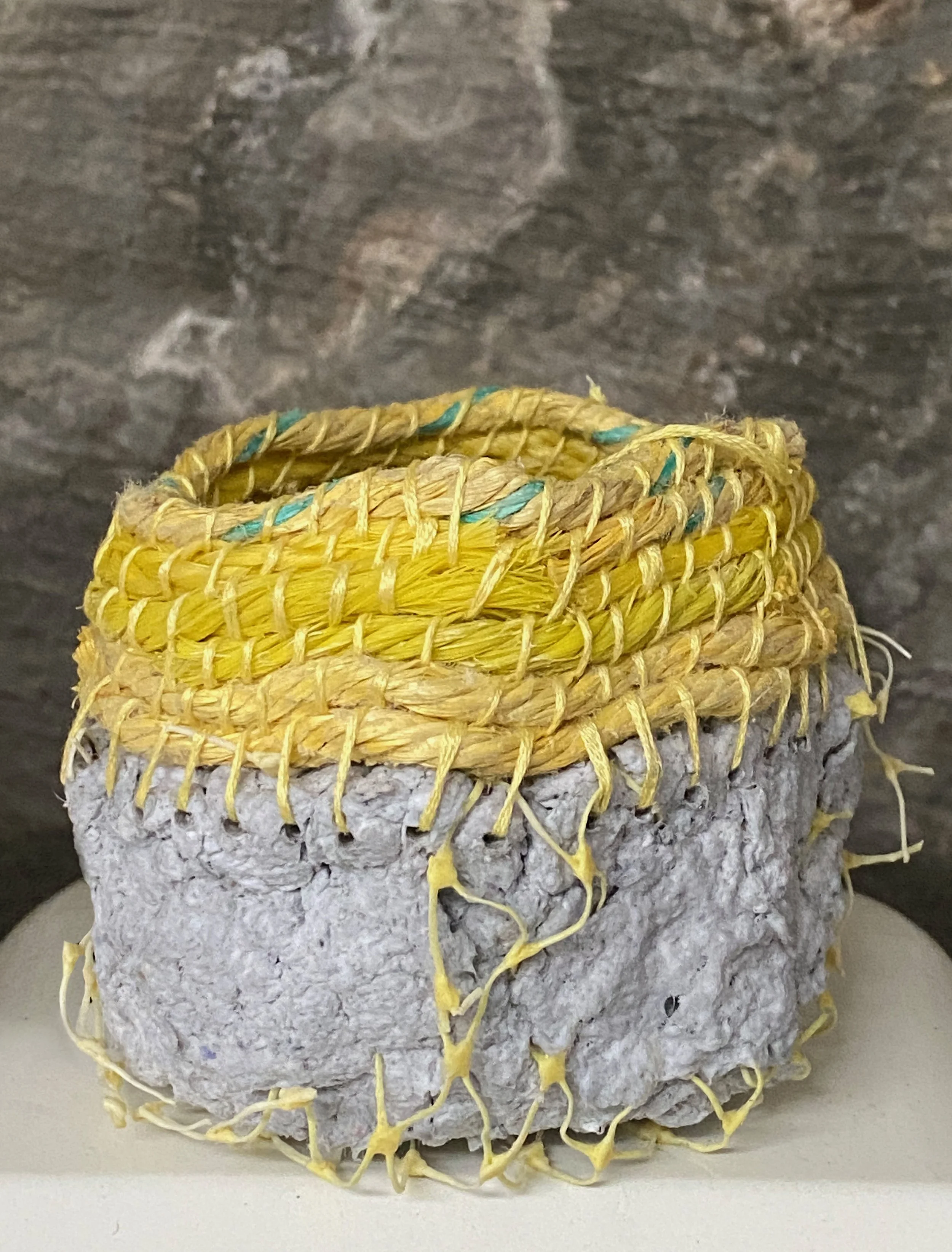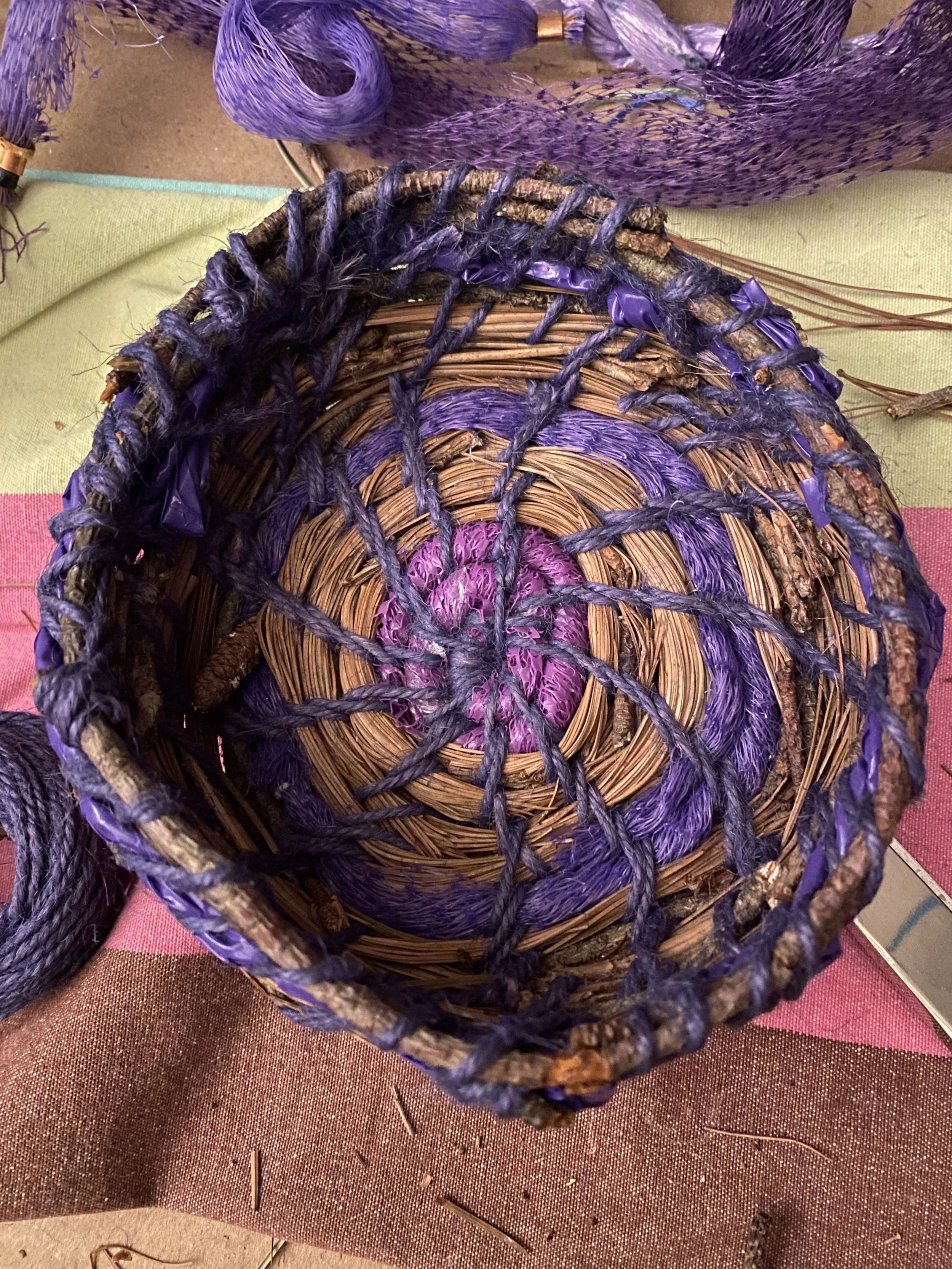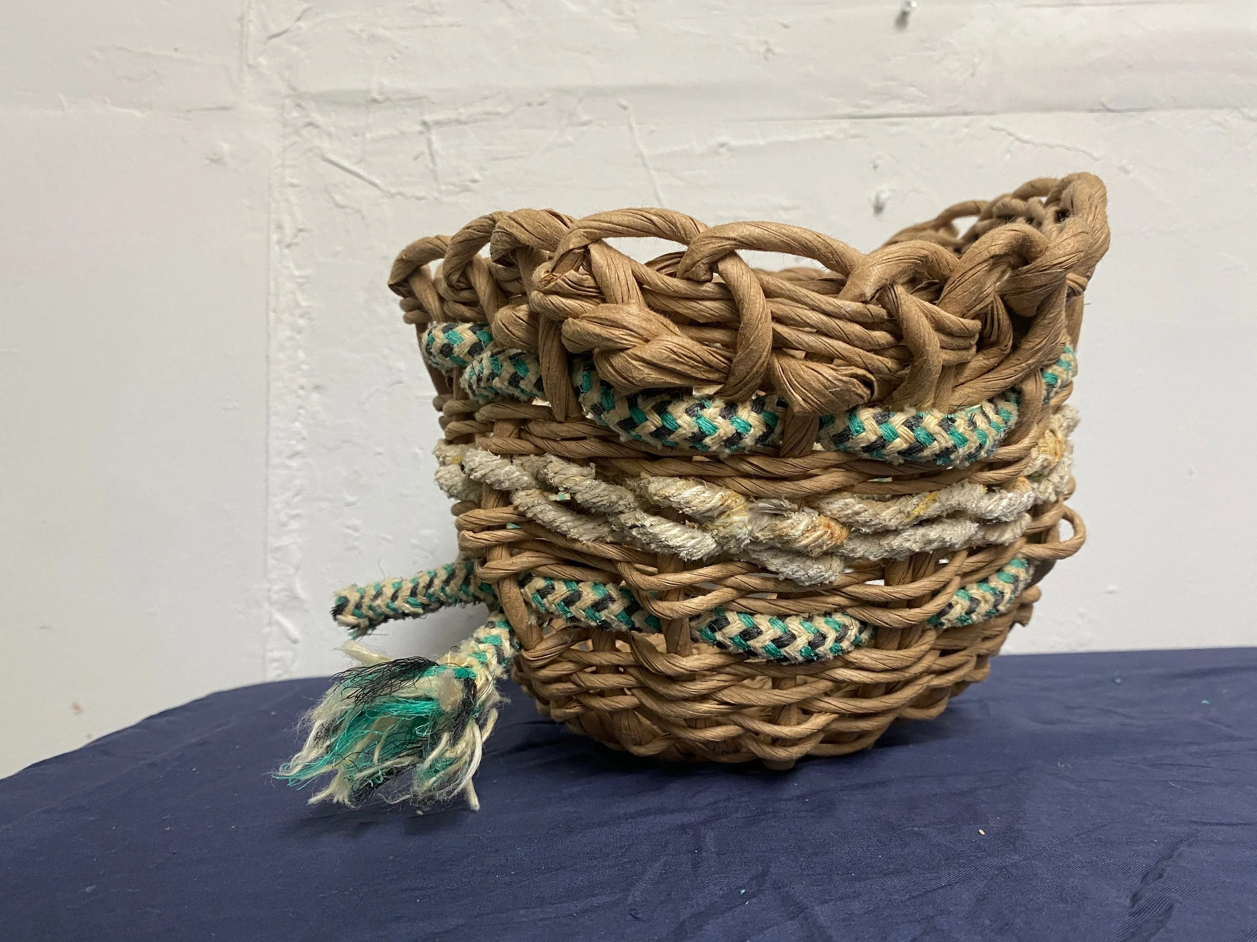 Using a variety of basketry techniques, I have been making baskets from harvested natural materials including invasive species like Japanese honeysuckle, discarded plastic trash including rope & strapping, recycled paper clay, and paper wicker.