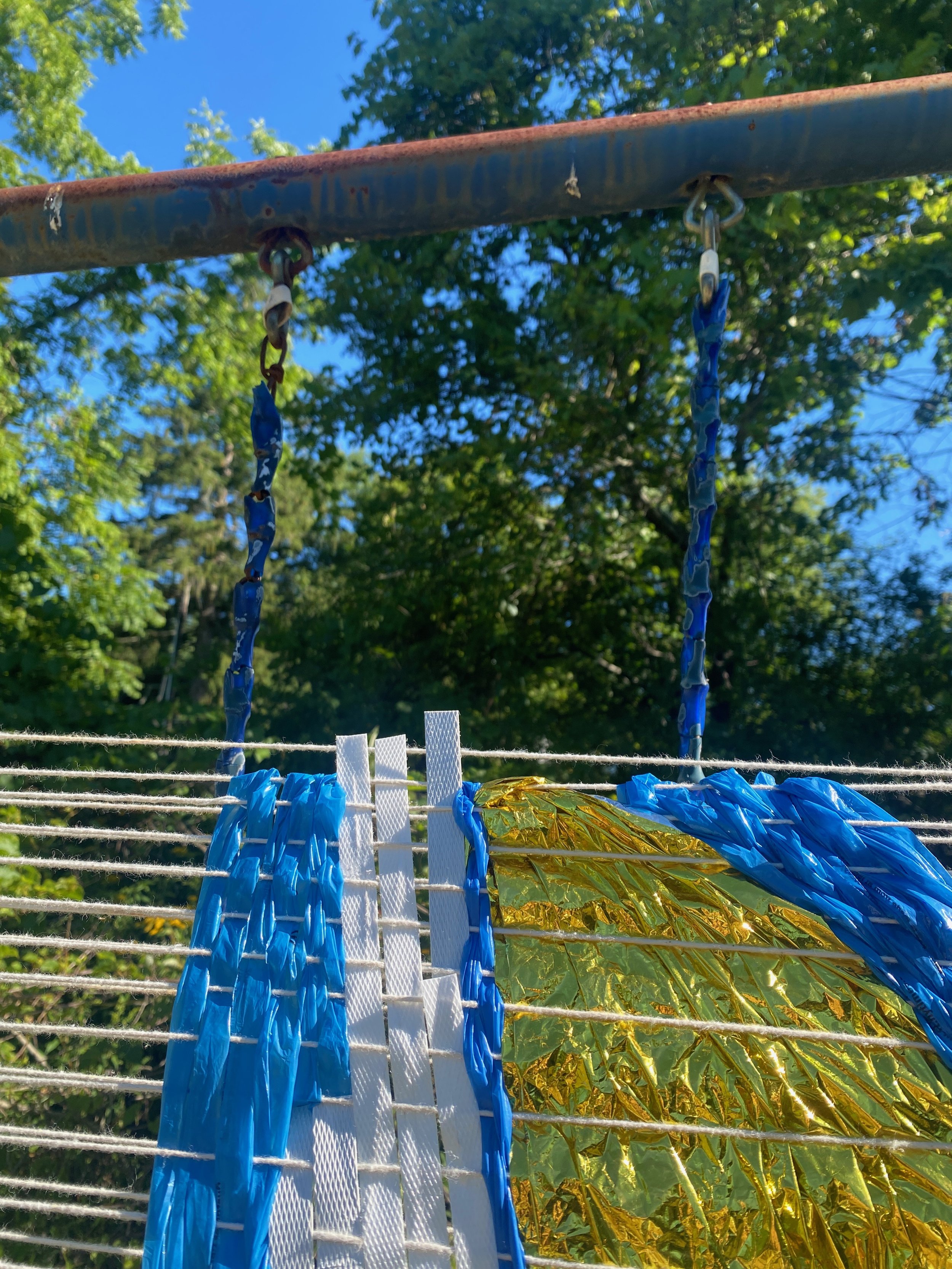 Made while in residency in 2022 at Arts Letters & Numbers, on the site of a closed textile mill in Averill Park, New York. I created a loom on an abandoned swing set on the property behind the old workers’ housing, then wove plastic trash and curly dock stems on it.
